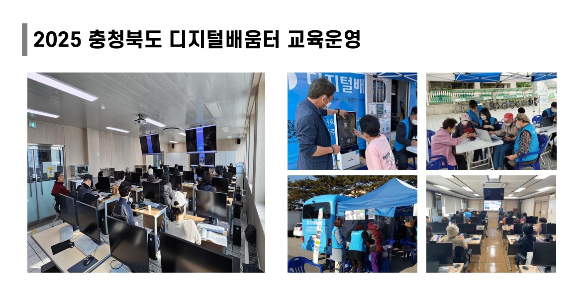 이앤오즈는 충청북도 내 전 지역을 대상으로 디지털배움터 교육을 운영하며시·군별 인구 구조와 접근성을 반영한 지역 맞춤형 디지털 교육 체계를 구축했습니다.기초 디지털 활용 능력 강화, 공공서비스 이해, 모바일 금융, 생활 AI 활용 등도민의 실제 생활에 필요한 실습 중심 교육을 중심으로 프로그램을 설계했습니다.충북 도민의 디지털 자립도 향상과 정보 접근성 개선에 중심 역할을 수행했습니다.
